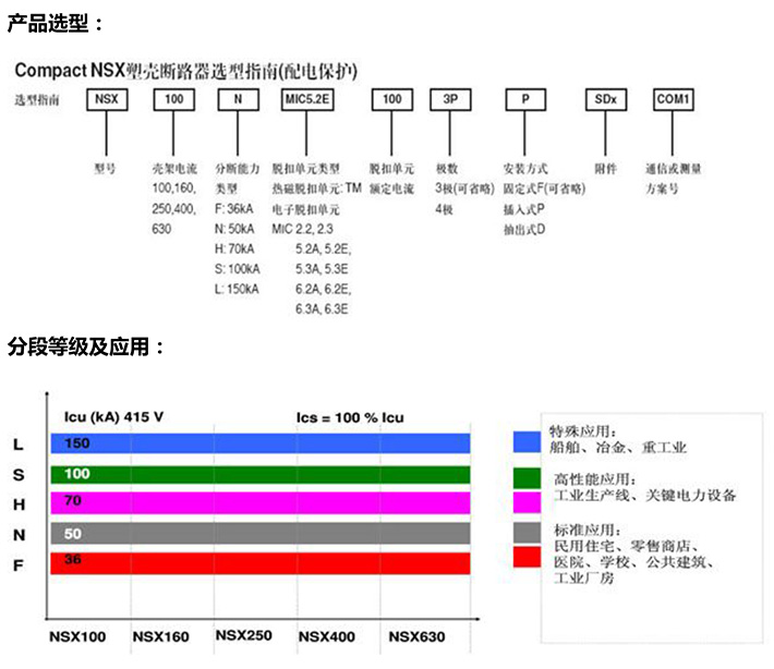 NSX系列塑料外殼式斷路器其額定絕緣電壓為950V,適用于交流50Hz或(60Hz),額定工作電壓690V及以下,額定工作電流12.5A至630A的電流中,用來分配電能,在正常條件下做不頻繁的閉合和斷開之用,并在線路和設備過載、欠電壓時起保護作用。額定殼架等級電流在400A及以下的斷路器,也可作鼠籠型電動機的不頻繁起動,運轉中斷開以及在電動機過載,短路及欠電壓時起保護作用。